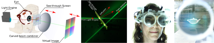 We present a new optical design for see-through near-eye displays that is simple, compact, varifocal, and provides a wide field of view with clear peripheral vision and large eyebox. Key to this effort is a novel see-through rear-projection screen. We project an image to the see-through screen using an off-axis path, which is then relayed to the user’s eyes through an on-axis partially-reflective magnifying surface. Converting the off-axis path to a compact on-axis imaging path simplifies the optical design. We establish fundamental trade-offs between the quantitative parameters of resolution, field of view, and the form-factor of our design. We demonstrate a wearable binocular near-eye display using off-the-shelf projection displays, custom- designed see-through spherical concave mirrors, and see-through screen designs using either custom holographic optical elements or polarization- selective diffusers.