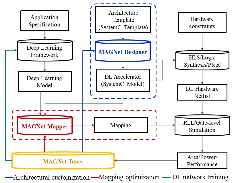 Deep neural networks have been adopted in a wide range of application domains, leading to high demand for inference accelerators. However, the high cost associated with ASIC hardware design makes it challenging to build custom accelerators for different targets. To lower design cost, we propose MAGNet, a modular accelerator generator for neural networks. MAGNet takes a target application consisting of one or more neural networks along with hardware constraints as input and produces synthesizable RTL for a neural network accelerator ASIC as well as valid mappings for running the target networks on the generated hardware. MAGNet consists of three key components: (i) MAGNet Designer, a highly configurable architectural template designed in C++ and synthesizable by high-level synthesis tools. MAGNet Designer supports a wide range of design-time parameters such as different data formats, diverse memory hierarchies, and dataflows. (ii) MAGNet Mapper, an automated framework for exploring different software mappings for executing a neural network on the generated hardware. (iii) MAGNet Tuner, a design space exploration framework encompassing the designer, the mapper, and a deep learning framework to enable fast design space exploration and co-optimization of architecture and application. We demonstrate the utility of MAGNet by designing an inference accelerator optimized for image classification application using three different neural networks—AlexNet, ResNet, and DriveNet. MAGNet-generated hardware is highly efficient and leverages a novel multi-level dataflow to achieve 40 fJ/op and 2.8 TOPS/mm^2 in a 16nm technology node for the ResNet-50 benchmark with <1% accuracy loss on the ImageNet dataset.