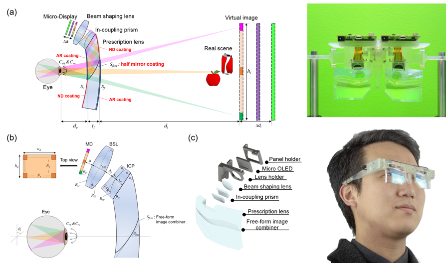 In this paper, we present a fully-customized AR display design that considers the user’s prescription, interpupillary distance, and taste of fashion. A free-form image combiner embedded inside the prescription lens provides augmented images onto the vision-corrected real world. The optics was optimized for each prescription level, which can reduce the mass production cost while satisfying the user’s taste. The foveated optimization method was applied which distributes the pixels in accordance with human visual acuity. Our design can cover myopia, hyperopia, astigmatism, and presbyopia, and allows the eye-contact interaction with privacy protection. A 169g dynamic prototype showed a 40° × 20° virtual image with a 23 cpd resolution at center field and 6 mm × 4 mm eye-box, with the vision-correction and varifocal (0.5-3m) capability.