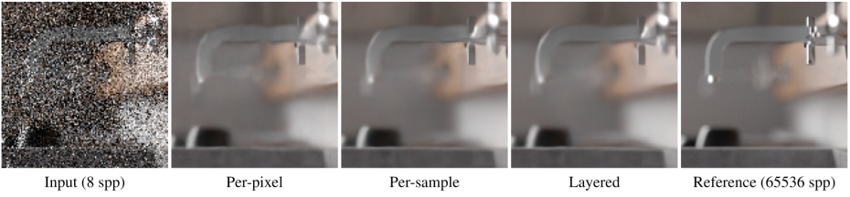We propose a novel approach for denoising Monte Carlo path traced images, which uses data from individual samples rather than relying on pixel aggregates. Samples are partitioned into layers, which are filtered separately, giving the network more freedom to handle outliers and complex visibility. Finally the layers are composited front-to-back using alpha blending. The system is trained end-to-end, with learned layer partitioning, filter kernels, and compositing. We obtain similar image quality as recent state-of-the-art sample based denoisers at a fraction of the computational cost and memory requirements.