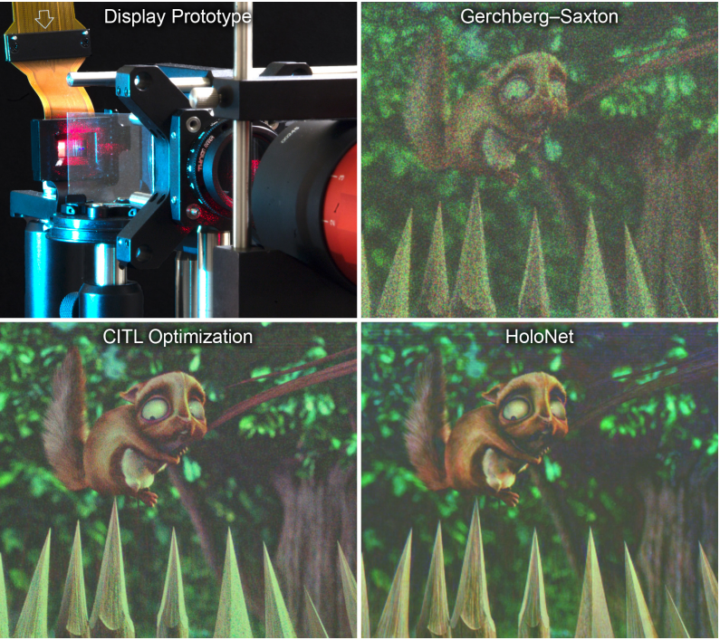 Holographic displays promise unprecedented capabilities for direct-view displays as well as virtual and augmented reality (VR/AR) applications. However, one of the biggest challenges for computer-generated holography (CGH) is the fundamental tradeoff between algorithm runtime and achieved image quality, which has prevented high-quality holographic image synthesis at fast speeds. Moreover, the image quality achieved by most holographic displays is low, due to the mismatch between physical light transport of the display and its simulated model. Here, we develop an algorithmic CGH framework that achieves unprecedented image fidelity and real-time framerates. Our framework comprises several parts, including a novel camera-in-the-loop optimization strategy that allows us to either optimize a hologram directly or train an interpretable model of the physical light transport and a neural network architecture that represents the first CGH algorithm capable of generating full-color holographic images at 1080p resolution in real time.