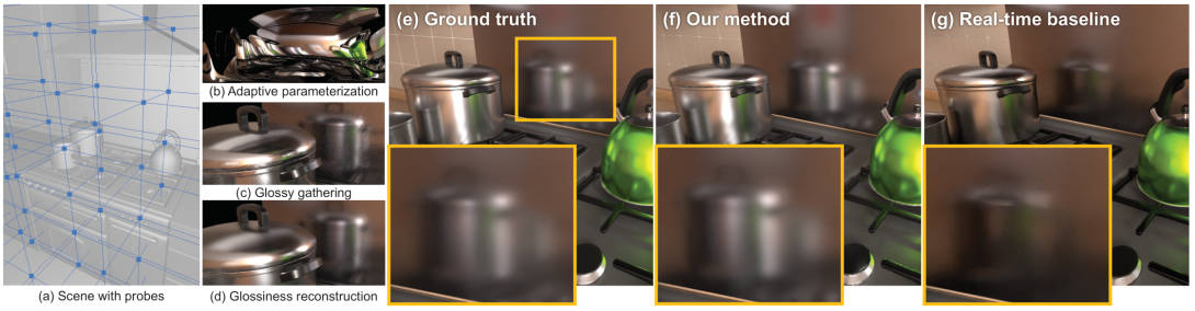 Recent rendering advances dramatically reduce the cost of global illumination. But even with hardware acceleration, complex light paths with multiple glossy interactions are still expensive; our new algorithm stores these paths in precomputed light probes and reprojects them at runtime to provide interactivity. Combined with traditional light maps for diffuse lighting our approach interactively renders all light paths in static scenes with opaque objects. Naively reprojecting probes with glossy lighting is memory-intensive, requires efficient access to the correctly reflected radiance, and exhibits problems at occlusion boundaries in glossy reflections. Our solution addresses all these issues. To minimize memory, we introduce an adaptive light probe parameterization that allocates increased resolution for shinier surfaces and regions of higher geometric complexity. To efficiently sample glossy paths, our novel gathering algorithm reprojects probe texels in a view-dependent manner using efficient reflection estimation and a fast rasterization-based search. Naive probe reprojection often sharpens glossy reflections at occlusion boundaries, due to changes in parallax. To avoid this, we split the convolution induced by the BRDF into two steps: we precompute probes using a lower material roughness and apply an adaptive bilateral filter at runtime to reproduce the original surface roughness. Combining these elements, our algorithm interactively renders complex scenes while fitting in the memory, bandwidth, and computation constraints of current hardware.