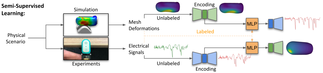 Tactile sensing is critical for robotic grasping and manipulation of objects under visual occlusion. However, in contrast to simulations of robot arms and cameras, current simulations of tactile sensors have limited accuracy, speed, and utility. In this work, we develop an efficient 3D finite element method (FEM) model of the SynTouch BioTac sensor using an open-access, GPU-based robotics simulator. Our simulations closely reproduce results from an experimentally-validated model in an industry-standard, CPU-based simulator, but at 75x the speed. We then learn latent representations for simulated BioTac deformations and real-world electrical output through self-supervision, as well as projections between the latent spaces using a small supervised dataset. Using these learned latent projections, we accurately synthesize real-world BioTac electrical output and estimate contact patches, both for unseen contact interactions. This work contributes an efficient, freely-accessible FEM model of the BioTac and comprises one of the first efforts to combine self-supervision, cross-modal transfer, and sim-to-real transfer for tactile sensors.