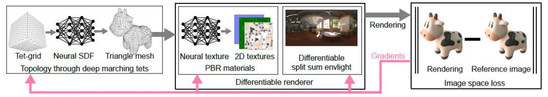 We present an efficient method for joint optimization of topology, materials and lighting from multi-view image observations. Unlike recent multi-view reconstruction approaches, which typically produce entangled 3D representations encoded in neural networks, we output triangle meshes with spatially-varying materials and environment lighting that can be deployed in any traditional graphics engine unmodified. We leverage recent work in differentiable rendering, coordinate-based networks to compactly represent volumetric texturing, alongside differentiable marching tetrahedrons to enable gradient-based optimization directly on the surface mesh. Finally, we introduce a differentiable formulation of the split sum approximation of environment lighting to efficiently recover all-frequency lighting. Experiments show our extracted models used in advanced scene editing, material decomposition, and high quality view interpolation, all running at interactive rates in triangle-based renderers (rasterizers and path tracers).