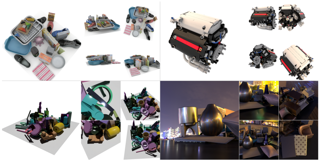 We present a large-scale synthetic dataset for novel view synthesis consisting of ~300k images rendered from nearly 2000 complex scenes using high-quality ray tracing at high resolution (1600 x 1600 pixels). The dataset is orders of magnitude larger than existing synthetic datasets for novel view synthesis, thus providing a large unified benchmark for both training and evaluation. Using 4 distinct sources of high-quality 3D meshes, the scenes of our dataset exhibit challenging variations in camera views, lighting, shape, materials, and textures. Because our dataset is too large for existing methods to process, we propose Sparse Voxel Light Field (SVLF), an efficient voxel-based light field approach for novel view synthesis that achieves comparable performance to NeRF on synthetic data, while being an order of magnitude faster to train and two orders of magnitude faster to render. SVLF achieves this speed by relying on a sparse voxel octree, careful voxel sampling (requiring only a handful of queries per ray), and reduced network structure; as well as ground truth depth maps at training time. Our dataset is generated by NViSII, a Python-based ray tracing renderer, which is designed to be simple for non-experts to use and share, flexible and powerful through its use of scripting, and able to create high-quality and physically-based rendered images. Experiments with a subset of our dataset allow us to compare standard methods like NeRF and mip-NeRF for single-scene modeling, and pixelNeRF for category-level modeling, pointing toward the need for future improvements in this area.