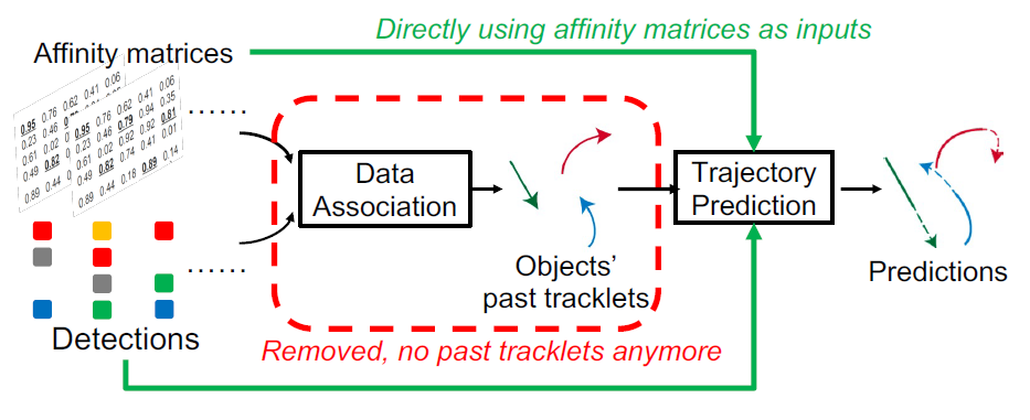 Multi-agent trajectory prediction is critical for planning and decision-making in human-interactive autonomous systems, such as self-driving cars. However, most prediction models are developed separately from their upstream perception (detection and tracking) modules, assuming ground truth past trajectories as inputs. As a result, their performance degrades significantly when using real-world noisy tracking results as inputs. This is typically caused by the propagation of errors from tracking to prediction, such as noisy tracks, fragments and identity switches. To alleviate this propagation of errors, we propose a new prediction pipeline that only requires detections and their affinity matrices across frames as inputs, entirely removing the need for error-prone data association during tracking. Since affinity matrices contain ‘soft’ information about the similarity and identity of detections across frames, predicting directly from them retains strictly more information than using the tracklets generated by data association in tracking. Thorough experiments on large-scale, real-world autonomous driving datasets show that our affinity-based prediction scheme reduces overall prediction errors by up to 60.2%, in comparison to standard prediction pipelines that use tracklets as inputs, with even more significant error reduction (up to 88.2%) if restricting the evaluation to challenging scenarios with tracking errors.