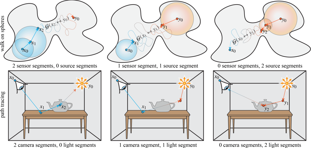 Numerically solving partial differential equations (PDEs) is central to many applications in computer graphics and scientific modeling. Conventional methods for solving PDEs often need to discretize the space first, making them less efficient for complex geometry. Unlike conventional methods, the walk on spheres (WoS) algorithm recently introduced to graphics is a grid-free Monte Carlo method that can provide numerical solutions of Poisson equations without discretizing space. We draw analogies between WoS and classical rendering algorithms, and find that the WoS algorithm is conceptually equivalent to forward path tracing. Inspired by similar approaches in light transport, we propose a novel WoS reformulation that operates in the reverse direction, starting at source points and estimating the Green's function at “sensor” points. Implementations of this algorithm show improvement over classical WoS in solving Poisson equation with sparse sources. Our approach opens exciting avenues for future algorithms for PDE estimation which, analogous to light transport, connect WoS walks starting from sensors and sources and combine different strategies for robust solution algorithms in all cases.
