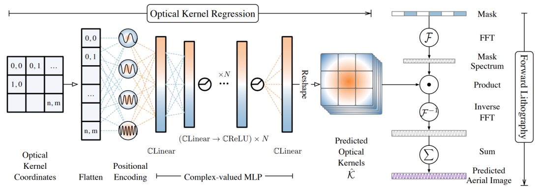Lithography is fundamental to integrated circuit fabrication, necessitating large computation overhead. The advancement of machine learning (ML)-based lithography models alleviates the trade-offs between manufacturing process expense and capability. However, all previous methods regard the lithography system as an image-to-image black box mapping, utilizing network parameters to learn by rote mappings from massive mask-to-aerial or mask-to-resist image pairs, resulting in poor generalization capability. In this paper, we propose a new ML-based paradigm disassembling the rigorous lithographic model into non-parametric mask operations and learned optical kernels containing determinant source, pupil, and lithography information. By optimizing complex-valued neural fields to perform optical kernel regression from coordinates, our method can accurately restore lithography system using a small-scale training dataset with fewer parameters, demonstrating superior generalization capability as well. Experiments show that our framework can use 31% of parameters while achieving 69× smaller mean squared error with 1.3× higher throughput than the state-of-the-art.