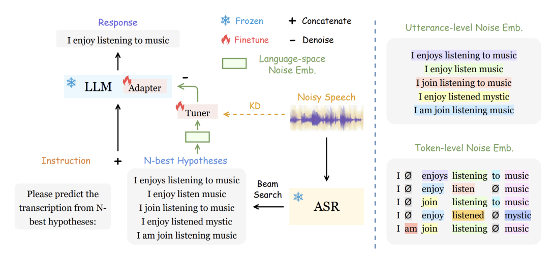 Recent advances in large language models (LLMs) have promoted generative error correction (GER) for automatic speech recognition (ASR), which leverages the rich linguistic knowledge and powerful reasoning ability of LLMs to improve recognition results. The latest work proposes a GER benchmark with HyPoradise dataset to learn the mapping from ASR N-best hypotheses to ground-truth transcription by efficient LLM finetuning, which shows great effectiveness but lacks specificity on noise-robust ASR. In this work, we extend the benchmark to noisy conditions and investigate if we can teach LLMs to perform denoising for GER just like what robust ASR do}, where one solution is introducing noise information as a conditioner into LLM. However, directly incorporating noise embeddings from audio encoder could harm the LLM tuning due to cross-modality gap. To this end, we propose to extract a language-space noise embedding from the N-best list to represent the noise conditions of source speech, which can promote the denoising process in GER. Furthermore, in order to enhance its representation ability of audio noise, we design a knowledge distillation (KD) approach via mutual information estimation to distill the real noise information in audio embeddings to our language embedding. Experiments on various latest LLMs demonstrate our approach achieves a new breakthrough with up to 53.9% correction improvement in terms of word error rate while with limited training data. Analysis shows that our language-space noise embedding can well represent the noise conditions of source speech, under which off-the-shelf LLMs show strong ability of language-space denoising.