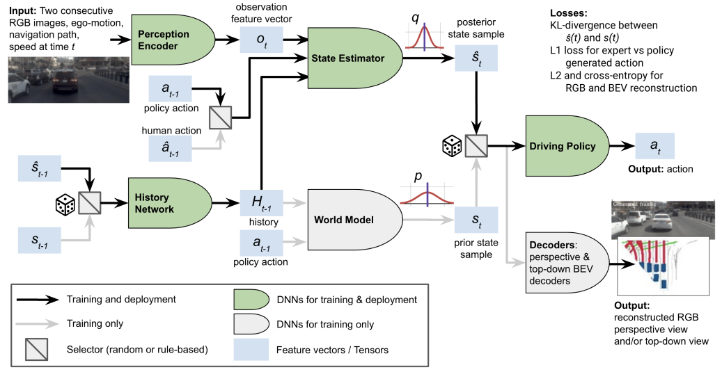 We propose the use of latent space generative world models to address the covariate shift problem in autonomous driving. A world model is a neural network capable of predicting an agent's next state given past states and actions. By leveraging a world model during training, the driving policy effectively mitigates covariate shift without requiring an excessive amount of training data. During end-to-end training, our policy learns how to recover from errors by aligning with states observed in human demonstrations, so that at runtime it can recover from perturbations outside the training distribution. Additionally, we introduce a novel transformer-based perception encoder that employs multi-view cross-attention and a learned scene query. We present qualitative and quantitative results, demonstrating significant improvements upon prior state of the art in closed-loop testing in the CARLA simulator, as well as showing the ability to handle perturbations in both CARLA and NVIDIA's DRIVE Sim.