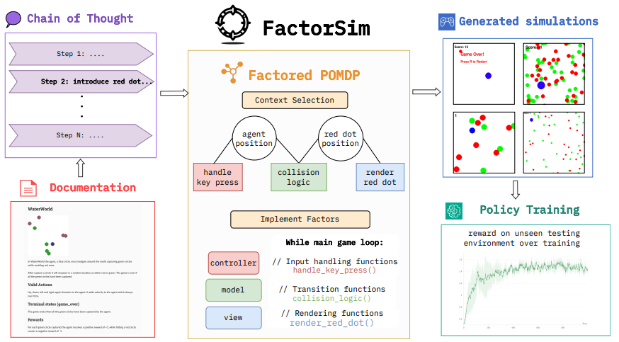 Generating simulations to train intelligent agents in game-playing and robotics from natural language input, from user input or task documentation, remains an open-ended challenge. Existing approaches focus on parts of this challenge, such as generating reward functions or task hyperparameters. Unlike previous work, we introduce FACTORSIM that generates full simulations in code from language input that can be used to train agents. Exploiting the structural modularity specific to coded simulations, we propose to use a factored partially observable Markov decision process representation that allows us to reduce context dependence during each step of the generation. For evaluation, we introduce a generative simulation benchmark that assesses the generated simulation code’s accuracy and effectiveness in facilitating zero-shot transfers in reinforcement learning settings. We show that FACTORSIM outperforms existing methods in generating simulations regarding prompt alignment (i.e., accuracy), zero-shot transfer abilities, and human evaluation. We also demonstrate its effectiveness in generating robotic tasks.