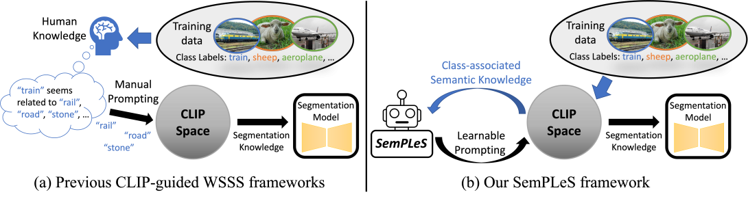 Weakly-Supervised Semantic Segmentation (WSSS) aims to train segmentation models using image data with only image-level supervision. Since precise pixel-level annotations are not accessible, existing methods typically focus on producing pseudo masks for training segmentation models by refining CAM-like heatmaps. However, the produced heatmaps may capture only the discriminative image regions of object categories or the associated co-occurring backgrounds. To address the issues, we propose a Semantic Prompt Learning for WSSS (SemPLeS) framework, which learns to effectively prompt the CLIP latent space to enhance the semantic alignment between the segmented regions and the target object categories. More specifically, we propose Contrastive Prompt Learning and Prompt-guided Semantic Refinement to learn the prompts that adequately describe and suppress the co-occurring backgrounds associated with each object category. In this way, SemPLeS can perform better semantic alignment between object regions and class labels, resulting in desired pseudo masks for training segmentation models. The proposed SemPLeS framework achieves competitive performance on standard WSSS benchmarks, PASCAL VOC 2012 and MS COCO 2014, and shows compatibility with other WSSS methods.