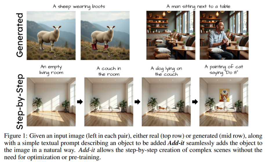 Adding Object into images based on text instructions is a challenging task in semantic image editing, requiring a balance between preserving the original scene and seamlessly integrating the new object in a fitting location. Despite extensive efforts, existing models often struggle with this balance, particularly with finding a natural location for adding an object in complex scenes. We introduce Add-it, a training-free approach that extends diffusion models' attention mechanisms to incorporate information from three key sources: the scene image, the text prompt, and the generated image itself. Our weighted extended-attention mechanism maintains structural consistency and fine details while ensuring natural object placement. Without task-specific fine-tuning, Add-it achieves state-of-the-art results on both real and generated image insertion benchmarks, including our newly constructed "Additing Affordance Benchmark" for evaluating object placement plausibility, outperforming supervised methods. Human evaluations show that Add-it is preferred in over 80% of cases, and it also demonstrates improvements in various automated metrics.