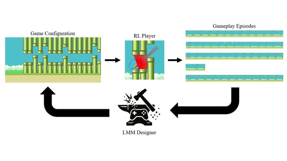 Game design hinges on understanding how static rules and content translate into dynamic player behavior---something modern generative systems that inspect only a game's code or assets struggle to capture. We present an automated design iteration framework that closes this gap by pairing a reinforcement learning (RL) agent, which playtests the game, with a large multimodal model (LMM), which revises the game based on what the agent does. In each loop the RL player completes several episodes, producing (i) numerical play metrics and/or (ii) a compact image strip summarising recent video frames. The LMM designer receives a gameplay goal and the current game configuration, analyses the play traces, and edits the configuration to steer future behaviour toward the goal. We demonstrate results that LMMs can reason over behavioral traces supplied by RL agents to iteratively refine game mechanics, pointing toward practical, scalable tools for AI-assisted game design.