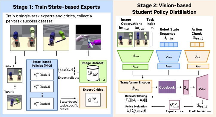 ACGD introduces a novel approach to visual multitask policy learning by leveraging asymmetric critics to guide the distillation process. Our method trains single-task expert policies and their corresponding critics using privileged state information. These experts are then used to distill a unified multi-task student policy that can generalize across diverse tasks. The student policy employs a VQ-VAE architecture with a transformer-based encoder and decoder, enabling it to predict discrete action tokens from image observations and robot states. We evaluate ACGD on three challenging multi-task domains—MyoDex, BiDex, and OpDex—and demonstrate significant improvements over baseline methods such as BC-RNN+DAgger, ACT, and MT-PPO. ACGD achieves a 10-15% performance boost across various dexterous manipulation benchmarks, showcasing its effectiveness in scaling to high degrees of freedom and complex visuomotor tasks.