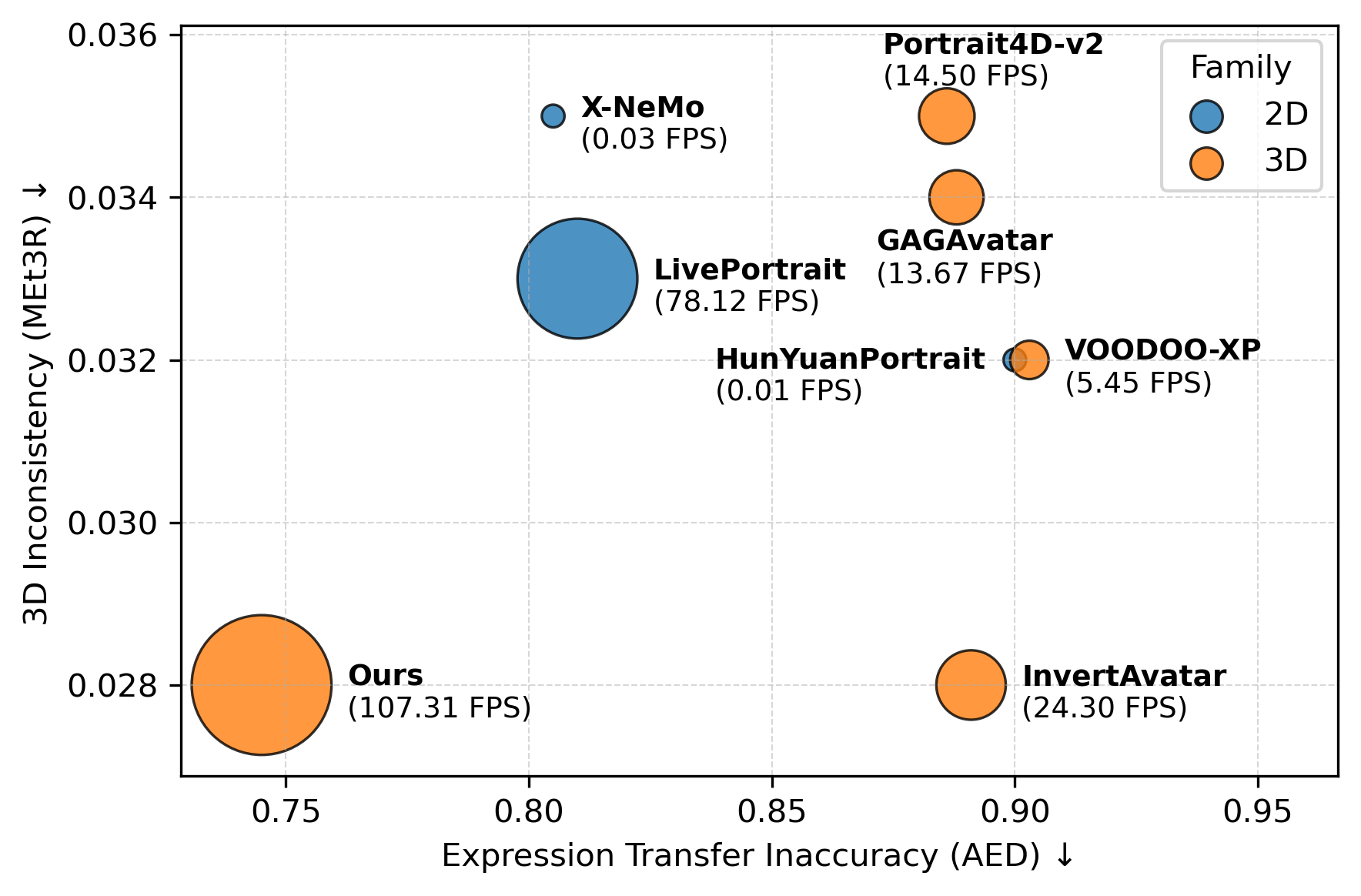 We provide a visualization of our quantitative comparisons against state-of-the-art methods in terms of 3D inconsistency (MEt3R ↓), expression transfer inaccuracy (AED ↓) and animation speed (FPS ↑, visualized as circle size). We compare against 7 state-of-the-art baselines - X-NeMo, HunyuanPortrait, Live-Portrait, GAGAvatar, Portrait4D-v2, VOODOO-XP, and InvertAvatar - using cross-reenactment. 2D methods tend to appear upper-left (better expression transfer, worse 3D consistency), while 3D methods tend to appear lower-right (worse expression transfer, better 3D consistency). Our method is 3–4 orders of magnitude faster than diffusion-based models (e.g. X-NeMo, HunYuanPortrait) while simultaneously achieving better 3D consistency and expression transfer accuracy.