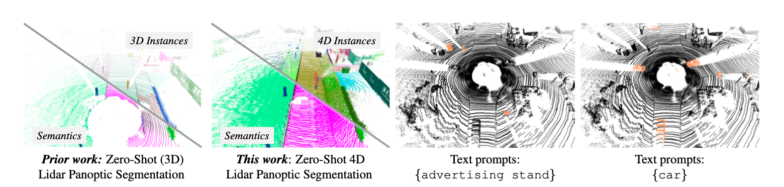 Prior methods (left) for zero-shot Lidar panoptic segmentation (Osep et al., ECCV'24) process individual (3D) point clouds in isolation. In contrast, our data-driven approach (right) operates directly on sequences of point clouds, jointly performing object segmentation, tracking, and zero-shot recognition based on text prompts specified at test time.