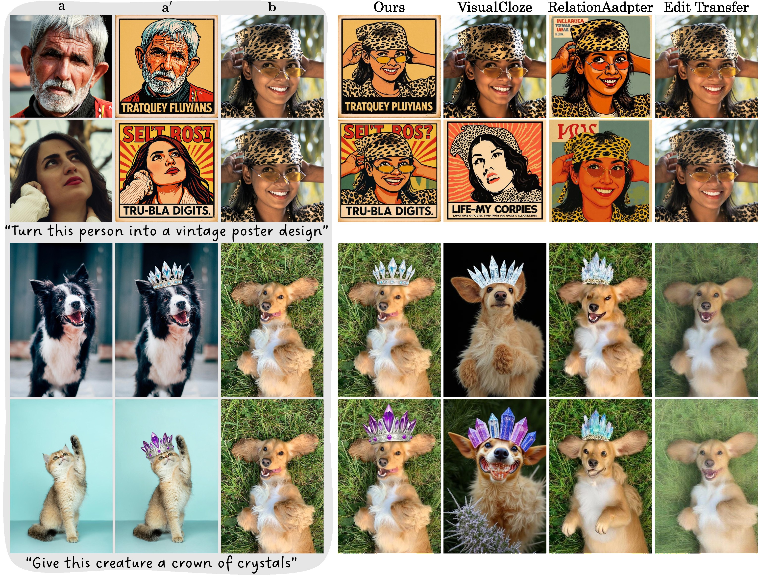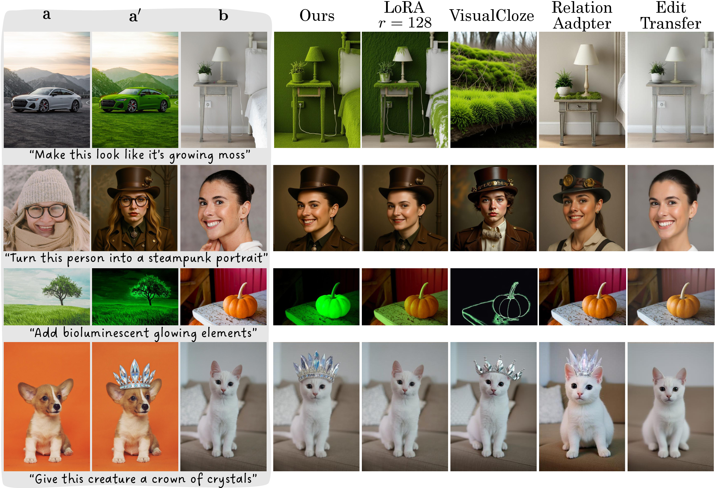 LoRWeB Overview: We first encode a and a', that describe a visual transformation (e.g., adding a hat to the man), and b, which should be edited analogously (e.g., adding a hat to the woman) with CLIP, and a small learned projection module.