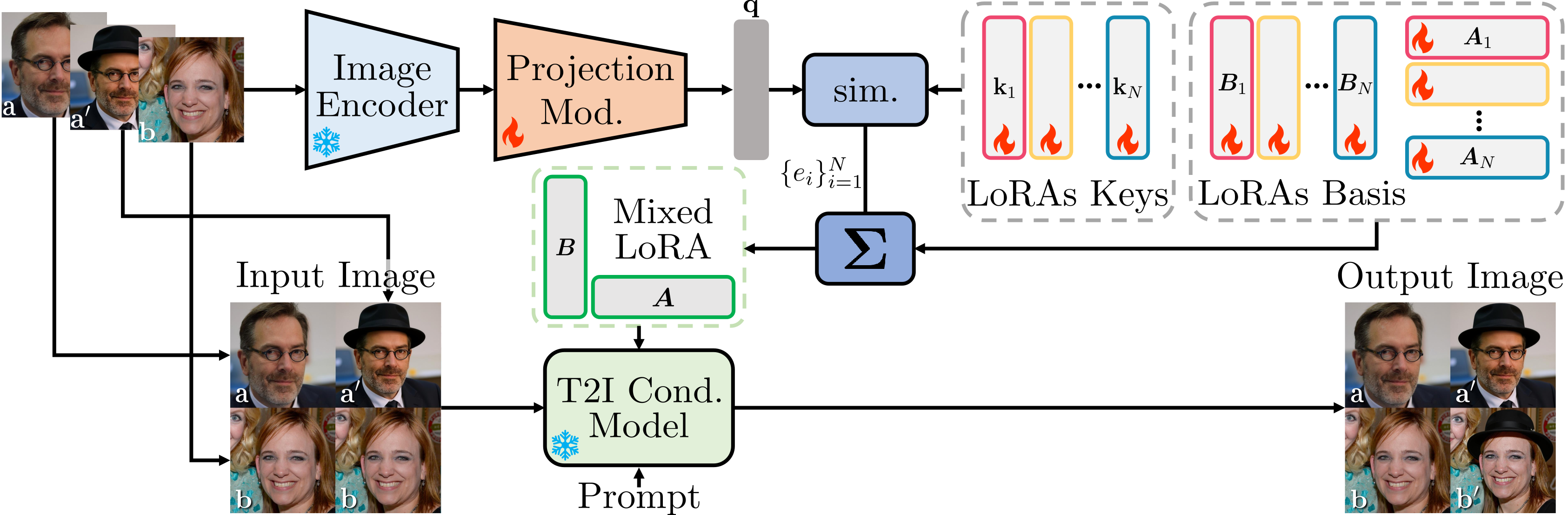 The similarity between the encoded vector and a set of learned keys determines the linear coefficients for combining the learned LoRAs into a single, mixed LoRA. This mixed LoRA is injected into a conditional flow model (e.g., Flux.1-Kontext).