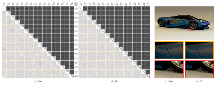 Low-discrepancy sequences have seen widespread adoption in computer graphics thanks to the superior rates of convergence that they provide. Because rendering integrals often are comprised of products of lower-dimensional integrals, recent work has focused on developing sequences that are also well-distributed in lower-dimensional projections. To this end, we introduce a novel construction of binary-based (0, 4)-sequences; that is, progressive fully multi-stratified sequences of 4D points, and extend the idea to higher power-of-two dimensions. We further show that not only it is possible to nest lower-dimensional sequences in higher-dimensional ones—for example, embedding a (0, 2)-sequence within our (0, 4)-sequence—but that we can ensemble two (0, 2)-sequences into a (0, 4)-sequence, four (0, 4)-sequences into a (0, 16)-sequence, and so on. Such sequences can provide excellent rates of convergence when integrals include lower-dimensional integration problems in 2, 4, 16,… dimensions. Our construction is based on using 2×2 block matrices as symbols to construct larger matrices that potentially generate a sequence with the target (0, s)-sequence in base s property. We describe how to search for suitable alphabets and identify two distinct, cross-related alphabets of block symbols, which we call s and z, hence SZ for the resulting family of sequences. Given the alphabets, we construct candidate generator matrices and search for valid sets of matrices. We then infer a simple recurrence formula to construct full-resolution (64-bit) matrices. Because our generator matrices are binary, they allow highly-efficient implementation using bitwise operations and can be used as a drop-in replacement for Sobol matrices in existing applications. We compare SZ sequences to state-of-the-art low discrepancy sequences, and demonstrate mean relative squared error improvements up to 1.93× in common rendering applications.