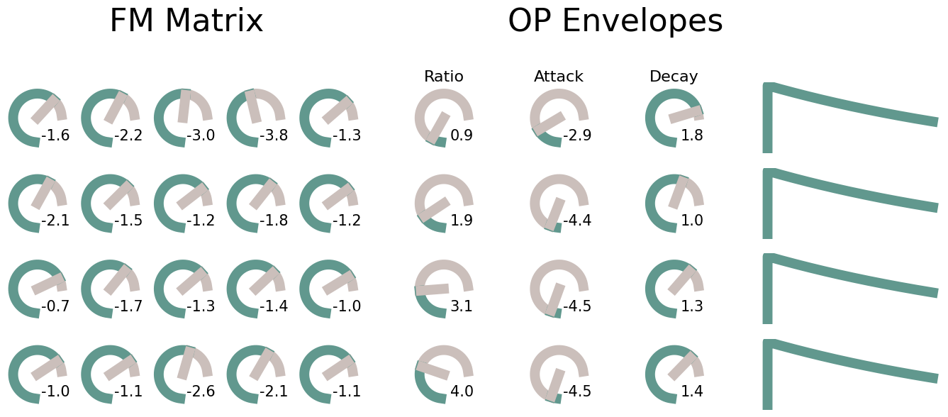 For FM synthesis, the parameters updated with Audio-SDS are the FM matrix and ratio, attack, and decay for each operator. Below, we visualize these as dials for an FM synthesis user interface, as well as the envelope and audio.