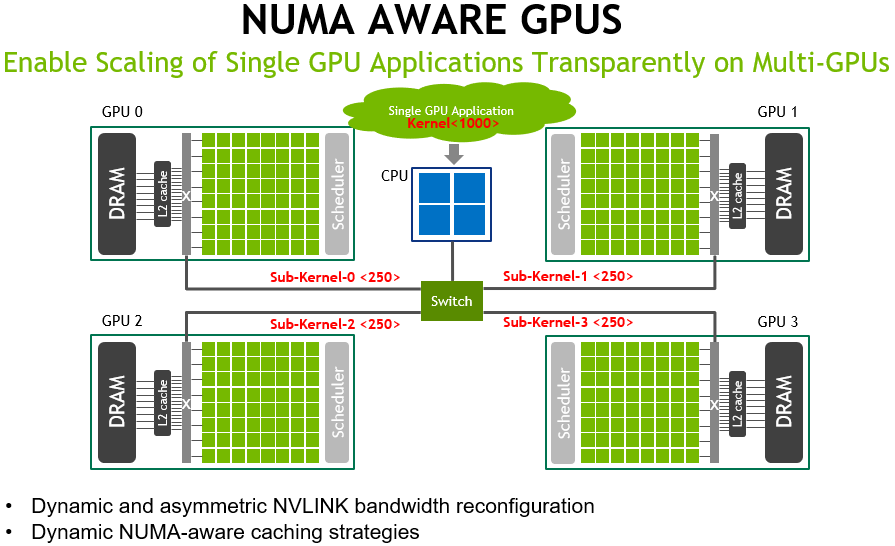 GPUs achieve high throughput and power efficiency by employing many small single instruction multiple thread (SIMT) cores. To minimize scheduling logic and performance variance they utilize a uniform memory system and leverage strong data parallelism exposed via the programming model. With Moore's law slowing, for GPUs to continue scaling performance (which largely depends on SIMT core count) they are likely to embrace multi-socket designs where transistors are more readily available. However when moving to such designs, maintaining the illusion of a uniform memory system is increasingly difficult. In this work we investigate multi-socket non-uniform memory access (NUMA) GPU designs and show that significant changes are needed to both the GPU interconnect and cache architectures to achieve performance scalability. We show that application phase effects can be exploited allowing GPU sockets to dynamically optimize their individual interconnect and cache policies, minimizing the impact of NUMA effects. Our NUMA-aware GPU outperforms a single GPU by 1.5×, 2.3×, and 3.2× while achieving 89%, 84%, and 76% of theoretical application scalability in 2, 4, and 8 sockets designs respectively. Implementable today, NUMA-aware multi-socket GPUs may be a promising candidate for scaling GPU performance beyond a single socket.