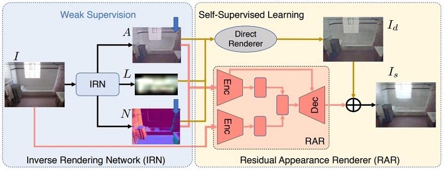 Inverse rendering aims to estimate physical attributes of a scene, e.g., reflectance, geometry, and lighting, from image(s). Inverse rendering has been studied primarily for single objects or with methods that solve for only one of the scene attributes. We propose the first learning based approach that jointly estimates albedo, normals, and lighting of an indoor scene from a single image. Our key contribution is the Residual Appearance Renderer (RAR), which can be trained to synthesize complex appearance effects (e.g., inter-reflection, cast shadows, near-field illumination, and realistic shading), which would be neglected otherwise. This enables us to perform self-supervised learning on real data using a reconstruction loss, based on re-synthesizing the input image from the estimated components. We finetune with real data after pretraining with synthetic data. To this end we use physically-based rendering to synthesize a large-scale training dataset. Experimental results show that our approach outperforms state-of-the-art methods that estimate one or more scene attributes.