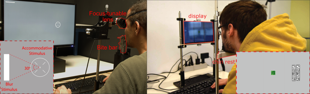Foveation and (de)focus are two important visual factors in designing near eye displays. Foveation can reduce computational load by lowering display details towards the visual periphery, while focal cues can reduce vergence-accommodation conflict thereby lessening visual discomfort in using near eye displays. We performed two psychophysical experiments to investigate the relationship between foveation and focus cues. The first study measured blur discrimination sensitivity as a function of visual eccentricity, where we found discrimination thresholds significantly lower than previously reported. The second study measured depth discrimination threshold where we found a clear dependency on visual eccentricity. We discuss the study results and suggest further investigation.