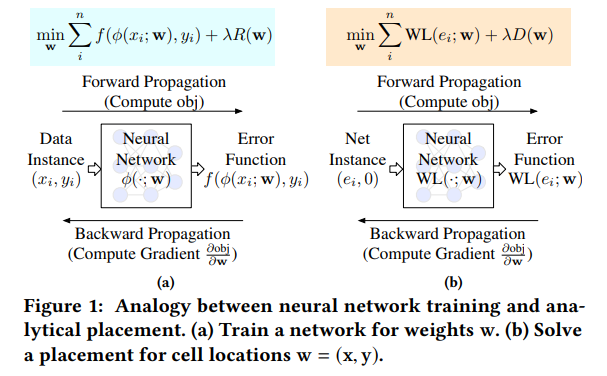 Placement for very-large-scale integrated (VLSI) circuits is one of the most important steps for design closure. We propose a novel GPU-accelerated placement framework DREAMPlace, by casting the analytical placement problem equivalently to training a neural network. Implemented on top of a widely-adopted deep learning toolkit PyTorch, with customized key kernels for wirelength and density computations, DREAMPlace can achieve around 40× speedup in global placement without quality degradation compared to the state-of-the-art multi-threaded placer RePlAce. We believe this work shall open up new directions for revisiting classical EDA problems with advancements in AI hardware and software.