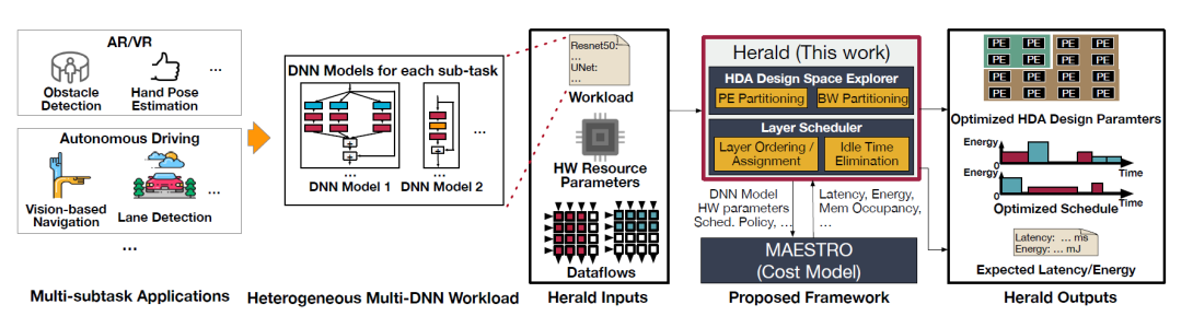 AI-enabled applications such as augmented and virtual reality (AR/VR) leverage multiple deep neural network (DNN) models for various sub-tasks such as object detection, image segmentation, eye-tracking, speech recognition, and so on. Because of the diversity of the sub-tasks, the layers within and across the DNN models are highly heterogeneous in operation and shape. Diverse layer operations and shapes are major challenges for a fixed dataflow accelerator (FDA) that employs a fixed dataflow strategy on a single DNN accelerator substrate since each layer prefers different dataflows (computation order and parallelization) and tile sizes. Reconfigurable DNN accelerators (RDAs) have been proposed to adapt their dataflows to diverse layers to address the challenge. However, the dataflow flexibility in RDAs is enabled at the cost of expensive hardware structures (switches, interconnects, controller, etc.) and requires per-layer reconfiguration, which introduces considerable energy costs. Alternatively, this work proposes a new class of accelerators, heterogeneous dataflow accelerators (HDAs), which deploy multiple accelerator substrates (i.e., sub-accelerators), each supporting a different dataflow. HDAs enable coarser-grained dataflow flexibility than RDAs with higher energy efficiency and lower area cost comparable to FDAs. To exploit such benefits, hardware resource partitioning across sub-accelerators and layer execution schedule need to be carefully optimized. Therefore, we also present Herald, a framework for co-optimizing hardware partitioning and layer scheduling. Using Herald on a suite of AR/VR and MLPerf workloads, we identify a promising HDA architecture, Maelstrom, which demonstrates 65.3% lower latency and 5.0% lower energy compared to the best fixed dataflow accelerators and 22.0% lower energy at the cost of 20.7% higher latency compared to a state-of-the-art reconfigurable DNN accelerator (RDA). The results suggest that HDA is an alternative class of Pareto-optimal accelerators to RDA with strength in energy, which can be a better choice than RDAs depending on the use cases.
