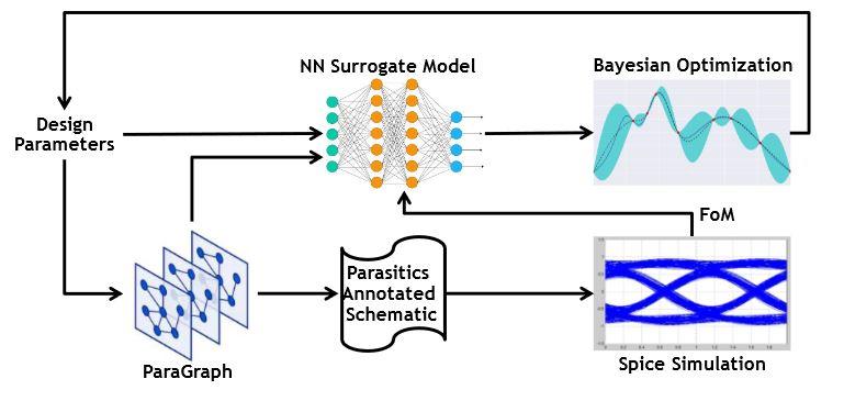 Layout parasitics significantly impact the performance of analog integrated circuits, leading to discrepancies between schematic and post-layout performance and requiring several iterations to achieve design convergence. Prior work has accounted for parasitic effects during the initial design phase but relies on automated layout generation for estimating parasitics. In this work, we leverage recent developments in parasitic prediction using graph neural networks to eliminate the need for in-the-loop layout generation. We propose an improved surrogate performance model using parasitic graph embeddings from the pre-trained parasitic prediction network. We further leverage dropout as an efficient prediction of uncertainty for Bayesian optimization to automate transistor sizing. Experimental results demonstrate the proposed surrogate model has 20% better R2 prediction score and improves optimization convergence by 3.7 times and 2.1 times compared to conventional Gaussian process regression and neural network based Bayesian linear regression, respectively. Furthermore, the inclusion of parasitic prediction in the optimization loop could guarantee satisfaction of all design constraints, while schematic-only optimization fail numerous constraints if verified with parasitic estimations.