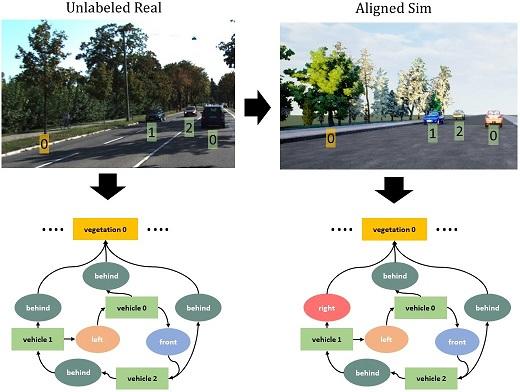 Synthetic data is emerging as a promising solution to the scalability issue of supervised deep learning, especially when real data are difficult to acquire or hard to annotate. Synthetic data generation, however, can itself be prohibitively expensive when domain experts have to manually and painstakingly oversee the process. Moreover, neural networks trained on synthetic data often do not perform well on real data because of the domain gap. To solve these challenges, we propose Sim2SG, a self-supervised automatic scene generation technique for matching the distribution of real data. Importantly, Sim2SG does not require supervision from the real-world dataset, thus making it applicable in situations for which such annotations are difficult to obtain. Sim2SG is designed to bridge both the content and appearance gaps, by matching the content of real data, and by matching the features in the source and target domains. We select scene graph (SG) generation as the downstream task, due to the limited availability of labeled datasets. Experiments demonstrate significant improvements over leading baselines in reducing the domain gap both qualitatively and quantitatively, on several synthetic datasets as well as the real-world KITTI dataset.