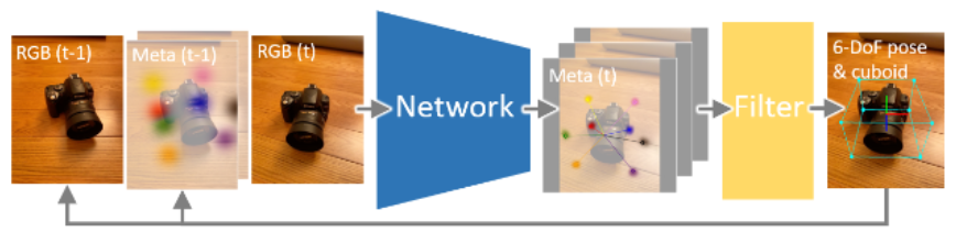 We propose a single-stage, category-level 6-DoF pose estimation algorithm that simultaneously detects and tracks instances of objects within a known category. Our method takes as input the previous and current frame from a monocular RGB video, as well as predictions from the previous frame, to predict the bounding cuboid and 6-DoF pose (up to scale). Internally, a deep network predicts distributions over object keypoints (vertices of the bounding cuboid) in image coordinates, after which a novel probabilistic filtering process integrates across estimates before computing the final pose using PnP. Our framework allows the system to take previous uncertainties into consideration when predicting the current frame, resulting in predictions that are more accurate and stable than single frame methods. Extensive experiments show that our method outperforms existing approaches on the challenging Objectron benchmark of annotated object videos. We also demonstrate the usability of our work in an augmented reality setting.