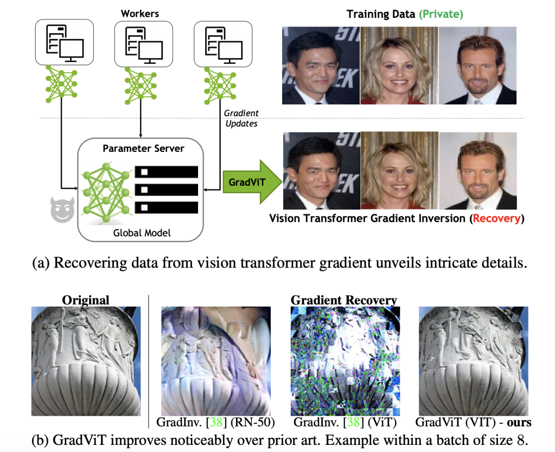 In this work we demonstrate the vulnerability of vision transformers (ViTs) to gradient-based inversion attacks. During this attack, the original data batch is reconstructed given model weights and the corresponding gradients. We introduce a method, named GradViT, that optimizes random noise into naturally looking images via an iterative process. The optimization objective consists of (i) a loss on matching the gradients, (ii) image prior in the form of distance to batch-normalization statistics of a pretrained CNN model, and (iii) a total variation regularization on patches to guide correct recovery locations. We propose a unique loss scheduling function to overcome local minima during optimization. We evaluate GadViT on ImageNet1K and MS-Celeb-1M datasets, and observe unprecedentedly high fidelity and closeness to the original (hidden) data. During the analysis we find that vision transformers are significantly more vulnerable than previously studied CNNs due to the presence of the attention mechanism. Our method demonstrates new state-of-the-art results for gradient inversion in both qualitative and quantitative metrics.