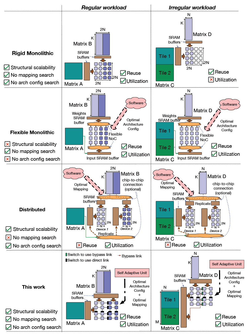 This work demonstrates a scalable reconfigurable accelerator (RA) architecture designed to extract maximum performance and energy efficiency for GEMM workloads. We also present a self-adaptive (SA) unit, which runs a learnt model for one-shot configuration optimization in hardware offloading the software stack thus easing the deployment of the proposed design. We evaluate an instance of the proposed methodology with a 32.768 TOPS reference implementation called SAGAR, that can provide the same mapping flexibility as a compute equivalent distributed system while achieving 3.5× more power efficiency and 3.2x higher compute density demonstrated via architectural and post-layout simulation.