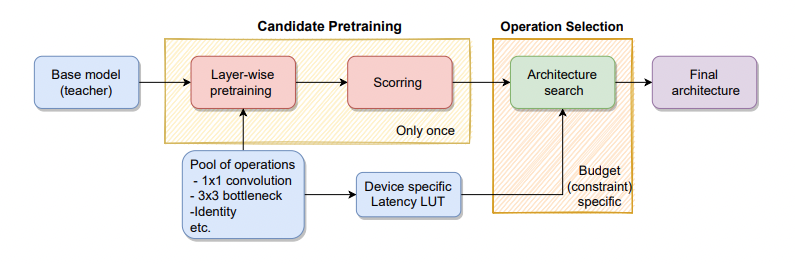 We introduce latency-aware network acceleration (LANA) - an approach that builds on neural architecture search techniques and teacher-student distillation to accelerate neural networks. LANA consists of two phases: in the first phase, it trains many alternative operations for every layer of the teacher network using layer-wise feature map distillation. In the second phase, it solves the combinatorial selection of efficient operations using a novel constrained integer linear optimization (ILP) approach. ILP brings unique properties as it (i) performs NAS within a few seconds to minutes, (ii) easily satisfies budget constraints, (iii) works on the layer-granularity, (iv) supports a huge search space O(10^100), surpassing prior search approaches in efficacy and efficiency. In extensive experiments, we show that LANA yields efficient and accurate models constrained by a target latency budget while being significantly faster than other techniques. We analyze three popular network architectures: EfficientNetV1, EfficientNetV2, and ResNeST, and achieve accuracy improvement for all models (up to 3.0%) when compressing larger models to the latency level of smaller models. LANA achieves significant speed-ups (up to 5×) with minor to no accuracy drop on GPU and CPU. The code will be shared soon.