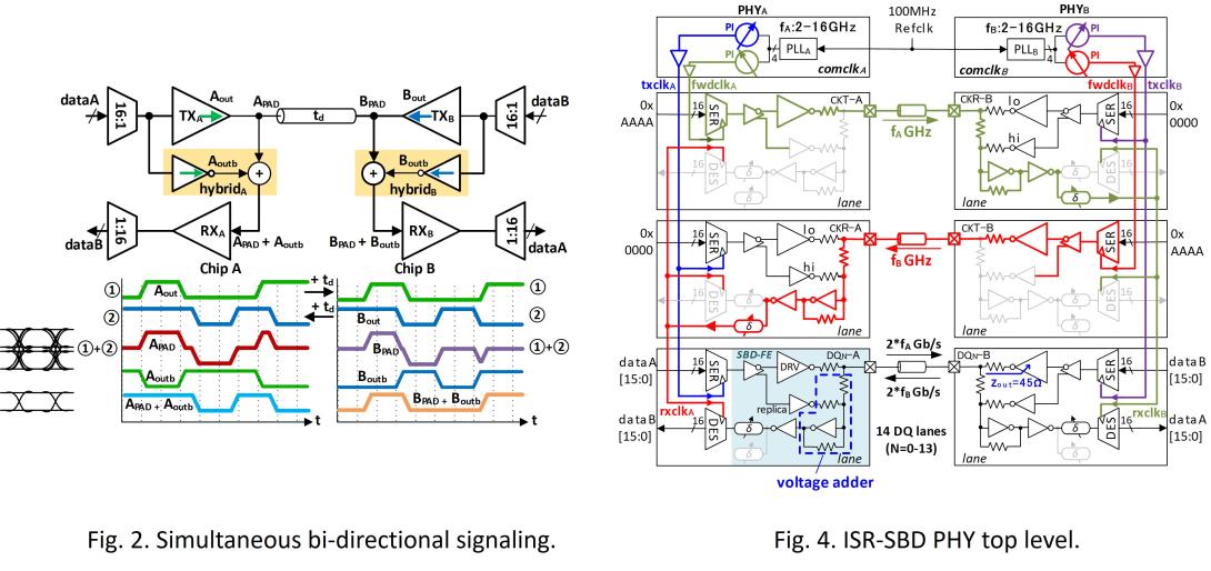 This article presents a clock-forwarded, inverter-based short-reach simultaneous bi-directional (ISR-SBD) physical layer (PHY) targeted for die-to-die communication over silicon interposers or similar high-density interconnect. Short-reach links of this type are increasingly important to support larger systems built with chiplets and multiple die and to facilitate the shift to medium- and long-range optical communication based on silicon photonics. This project explores the advantages of simultaneous bi-directional signaling (SBD) over other bandwidth-doubling techniques (e.g., PAM4). Fabricated in a 5-nm standard CMOS process, the ISR-SBD PHY demonstrates 50.4 Gb/s/wire (25.2 Gb/s each direction) and 0.297 pJ/bit on a 750-mV supply over a 1.2-mm on- chip channel.
