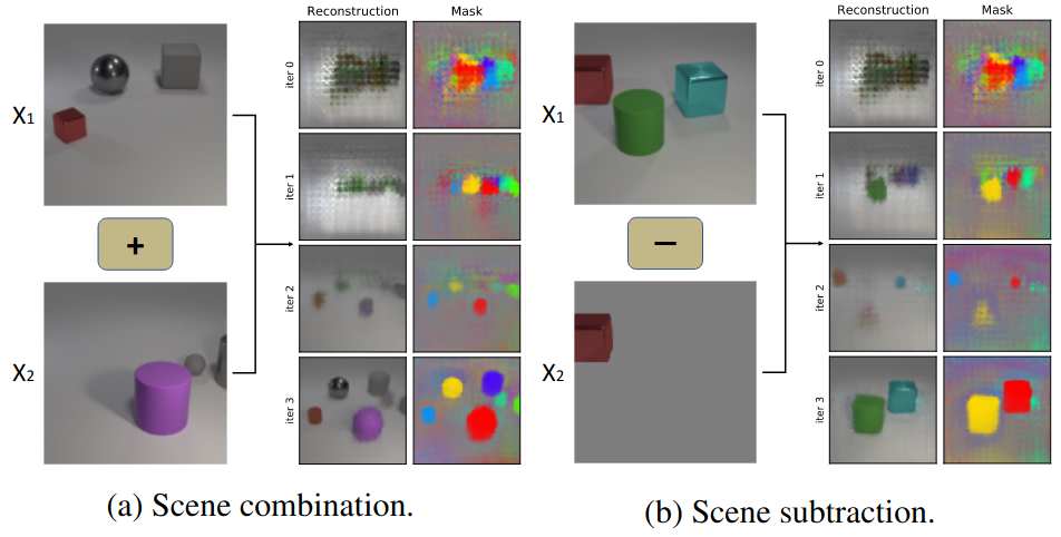 Humans are remarkably good at understanding and reasoning about complex visual scenes. The capability to decompose low-level observations into discrete objects allows us to build a grounded abstract representation and identify the compositional structure of the world. Accordingly, it is a crucial step for machine learning models to be capable of inferring objects and their properties from visual scenes without explicit supervision. However, existing works on object-centric representation learning either rely on tailor-made neural network modules or strong probabilistic assumptions in the underlying generative and inference processes. In this work, we present EGO, a conceptually simple and general approach to learning object-centric representations through an energy-based model. By forming a permutation-invariant energy function using vanilla attention blocks readily available in Transformers, we can infer object-centric latent variables via gradient-based MCMC methods where permutation equivariance is automatically guaranteed. We show that EGO can be easily integrated into existing architectures and can effectively extract high-quality object-centric representations, leading to better segmentation accuracy and competitive downstream task performance. Further, empirical evaluations show that EGO’s learned representations are robust against distribution shift. Finally, we demonstrate the effectiveness of EGO in systematic compositional generalization, by re-composing learned energy functions for novel scene generation and manipulation.