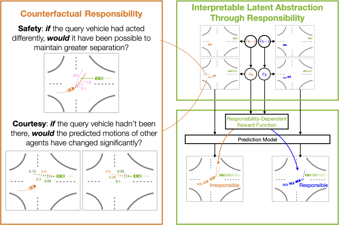 The ability to anticipate surrounding agents’ behaviors is critical to enable safe and seamless autonomous vehicles (AVs). While phenomenological methods have successfully predicted future trajectories from scene context, these predictions lack interpretability. On the other hand, ontological approaches assume an underlying structure able to describe the interaction dynamics or agents’ internal decision processes. Still, they often suffer from poor scalability or cannot reflect diverse human behaviors. This work proposes an interpretability framework for a phenomenological method through responsibility evaluations. We formulate responsibility as a measure of how much an agent takes into account the welfare of other agents through counterfactual reasoning. Additionally, this framework abstracts the computed responsibility sequences into different responsibility levels and grounds these latent levels into a trajectory prediction model. The proposed responsibility-based interpretability framework is modular and easily integrated into a wide range of prediction models. To demonstrate the utility of the proposed framework in providing added interpretability, we adapt an existing AV prediction model and perform a simulation study on a real-world nuScenes traffic dataset. Experimental results show that we can perform offline ex-post traffic analysis by incorporating the responsibility signal and rendering interpretable but accurate online trajectory predictions.