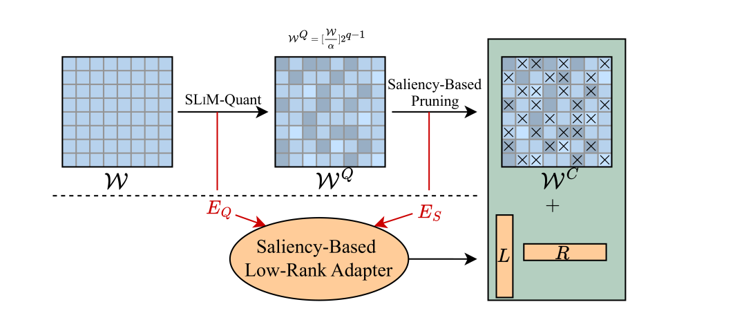 Conventional model compression techniques for LLMs address high memory consumption and slow inference challenges but typically require computationally expensive retraining to preserve accuracy. In contrast, one-shot compression methods eliminate retraining costs, but struggle to achieve accuracy comparable to dense models. This paper presents SLIM, a new one-shot compression framework that holistically integrates hardware-friendly quantization, sparsity, and low-rank approximation into a unified process. First, we formulate the quantization process using a probabilistic approach (SLIM-Quant) that enables us to apply uniform quantization. Then, we use an existing one-shot pruning method to apply semi-structured sparsity on top of the quantized weights. Finally, to compensate for the introduced aggregated quantization and sparsity error, we use a novel saliency function with unique invertible and additive features that enables us to mathematically compute the value of low-rank adapters. SLIM improves model accuracy by up to 5.66% (LLaMA-2-7B) for 2:4 sparsity with 4-bit weight quantization, outperforming prior methods. Models compressed with SLIM achieve up to 4.3× and 3.8× layer-wise speedup on Nvidia RTX3060 and A100 GPUs, respectively. Additionally, they achieve up to 0.23× end-to-end memory reduction in comparison to their dense counterparts. We also propose an optional PEFT recipe that further improves accuracy by up to 1.66% (LLaMA-2-13B) compared to SLIM without fine-tuning.