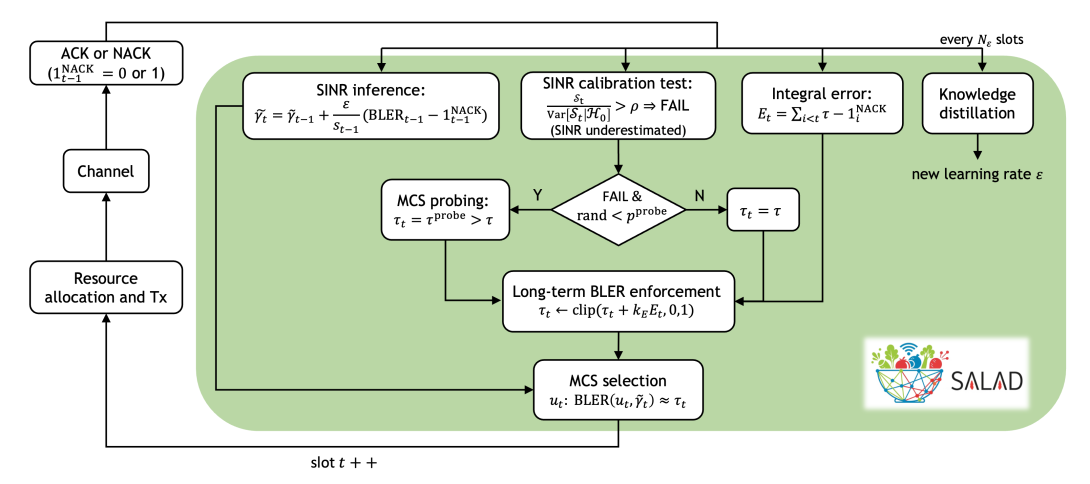 SALAD infers the SINR by minimizing the cross-entropy loss between received ACK/NACKs and predicted BLER values, with a learning rate that self-adapts online through knowledge distillation. Based on this inference, SALAD selects the MCS via hypothesis testing: if the SINR is likely underestimated, a higher MCS is selected to accelerate link adaptation under improving channel conditions. To prevent BLER drift from its long-term target, SALAD incorporates a feedback control loop that adjusts the instantaneous BLER target.