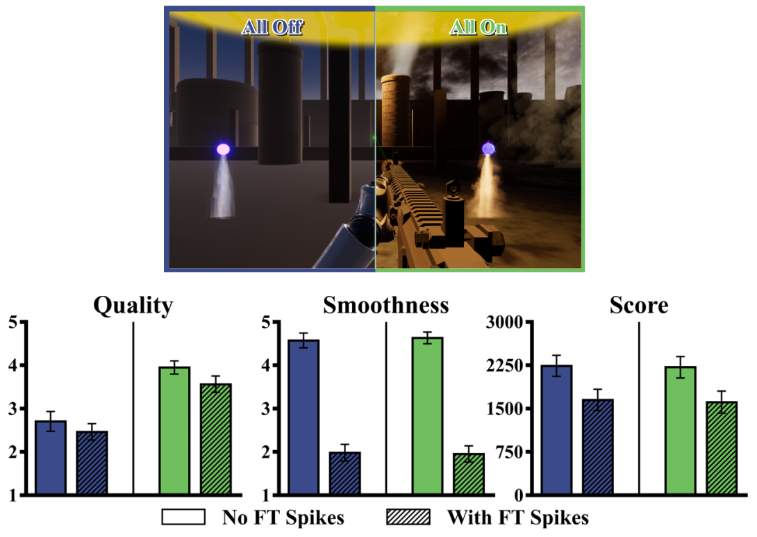 Frametime spikes and graphical fidelity both matter for the feel of first-person shooter (FPS) games, yet their combined effects are not well understood. This paper examines how graphics settings and frametime spikes during aiming interact with player performance and experience. We developed a custom FPS game with configurable textures, lighting, and visual effects, and induced frametime spikes of 0 ms, 225 ms, or 675 ms during play. Twenty-one participants completed all combinations of graphics and spikes while providing performance data and subjective ratings for visual quality and smoothness. Results show that graphics quality primarily affects perceived visual quality, while frametime spikes primarily reduce perceived smoothness. Performance (i.e., score and accuracy) declines with larger spikes but remains largely unchanged across graphics settings. These findings suggest that spike magnitude, rather than graphics quality, is the dominant factor shaping smoothness and performance, while players still notice higher-quality graphics.