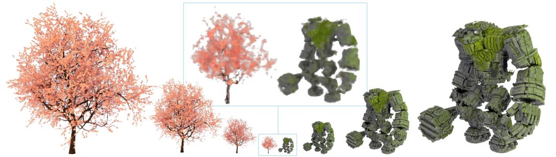 Neural approximations of scalar and vector fields, such as signed distance functions and radiance fields, have emerged as accurate, high-quality representations. State-of-the-art results are obtained by conditioning a neural approximation with a lookup from trainable feature grids that take on part of the learning task and allow for smaller, more efficient neural networks. Unfortunately, these feature grids usually come at the cost of significantly increased memory consumption compared to stand-alone neural network models. We present a dictionary method for compressing such feature grids, reducing their memory consumption by up to 100 times and permitting a multiresolution representation which can be useful for out-of-core streaming. We formulate the dictionary optimization as a vector-quantized auto-decoder problem which lets us learn end-to-end discrete neural representations in a space where no direct supervision is available and with dynamic topology and structure.